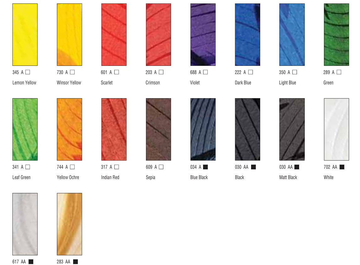 All inks have been formulated with single pigments wherever possible to allow for clean colour mixtures. While the inks have a high permanence rating (AA or A), they are not waterproof, which means you can reactivate and rework them with water even after they have dried.