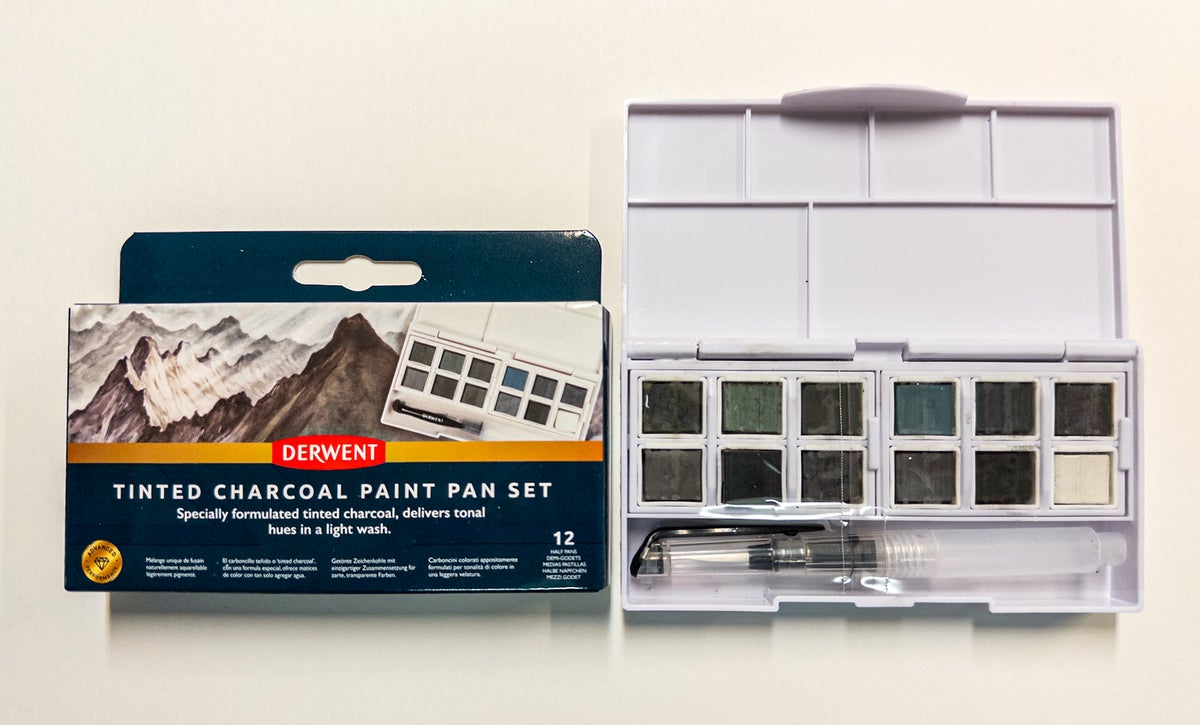 The Derwent Tinted Charcoal Paint Pan Set is a unique medium that blends the expressive quality of charcoal with the fluidity of paint. These are not standard watercolors; they are water-soluble charcoal mixed with a hint of pigment. This creates deep, muted, and moody hues with a signature matte finish and granular texture.