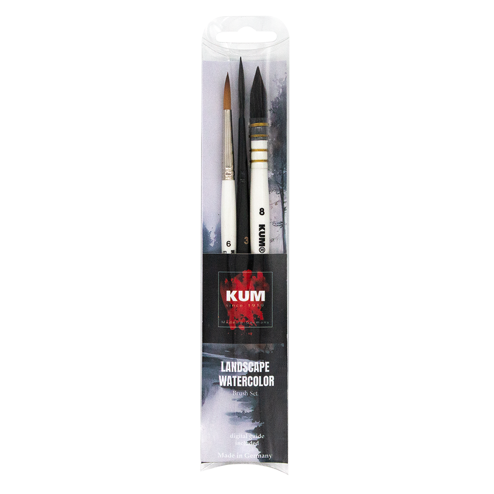 With the combination of a Memory Point, a Faded and a French Aqua Brush, you get everything from the KUM watercolor universe. The Memory Point Brush, with its exceptional tip and high elasticity, ensures maximum brush control and fine lines. Thanks to its special fibre blend, the rigger from the Faded series offers an extremely large capacity and thus enables particularly long and fine lines. It doesn’t work without it! The French Aqua Wash Brush is the best choice for loose brush strokes and backgrounds. Together they form a harmonious team – perfectly coordinated for your watercolor landscapes.